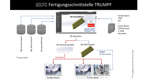 Auch importierte Teile mit Ungenauigkeiten werden fertigungsgerecht abgewickelt, ebenso scharfkantige, nicht verrundete Volumenkörper. Dabei werden alle in der SPI Datenbank hinterlegten Technologieinformationen wie Material, Blechstärke und Biege-, Stanz- und Umformwerkzeugdaten berücksichtigt. SPI liefert die fertigungsgerechte Abwicklung, die an Laser-, und Biegeprogramme übergeben wird und dort mit geringstem oder keinem Aufwand für die Ansteuerung der Maschinen verwendet werden kann.