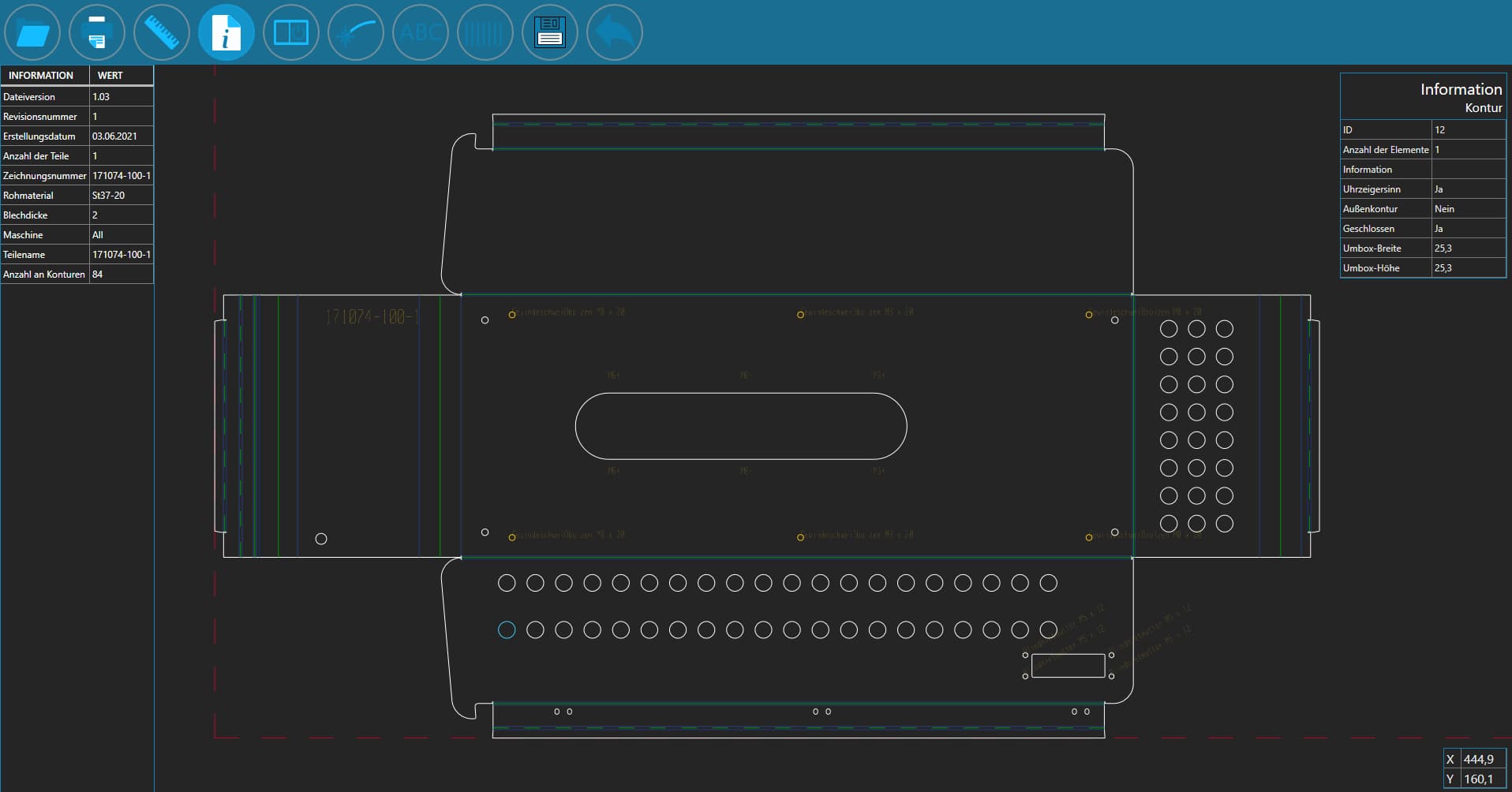 Dateiinformationen geben Auskunft über weitere, nicht-grafische, in der Datei enthaltene Parameter wie zum Beispiel Anzahl der Teile, Anzahl an Konturen, Blechdicke, Drehbarkeit, Erstellungsdatum, Kunde, Maschine, Material, Zeichnungsbezeichnung und Zeichnungsnummer. Mehr geht nicht...