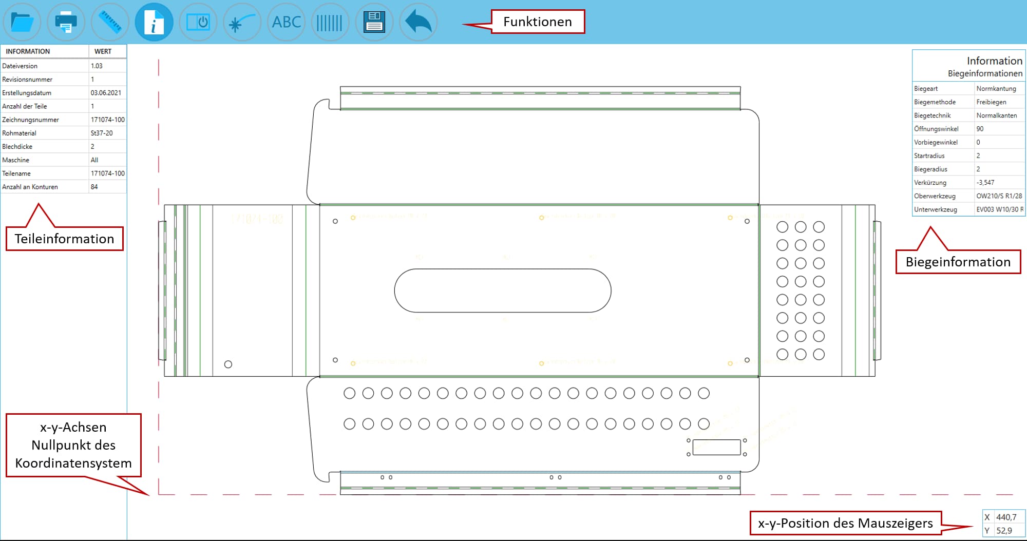 Nachdem eine Datei zur Ansicht geladen ist, werden - gemäß Konfiguration der Anzeigeparameter - z.B. Außen- und Innenkonturen, Biegelinien, Biegezonen, Teilekennzeichnungen, Werkzeug-IDs und Bearbeitungsmuster angezeigt.